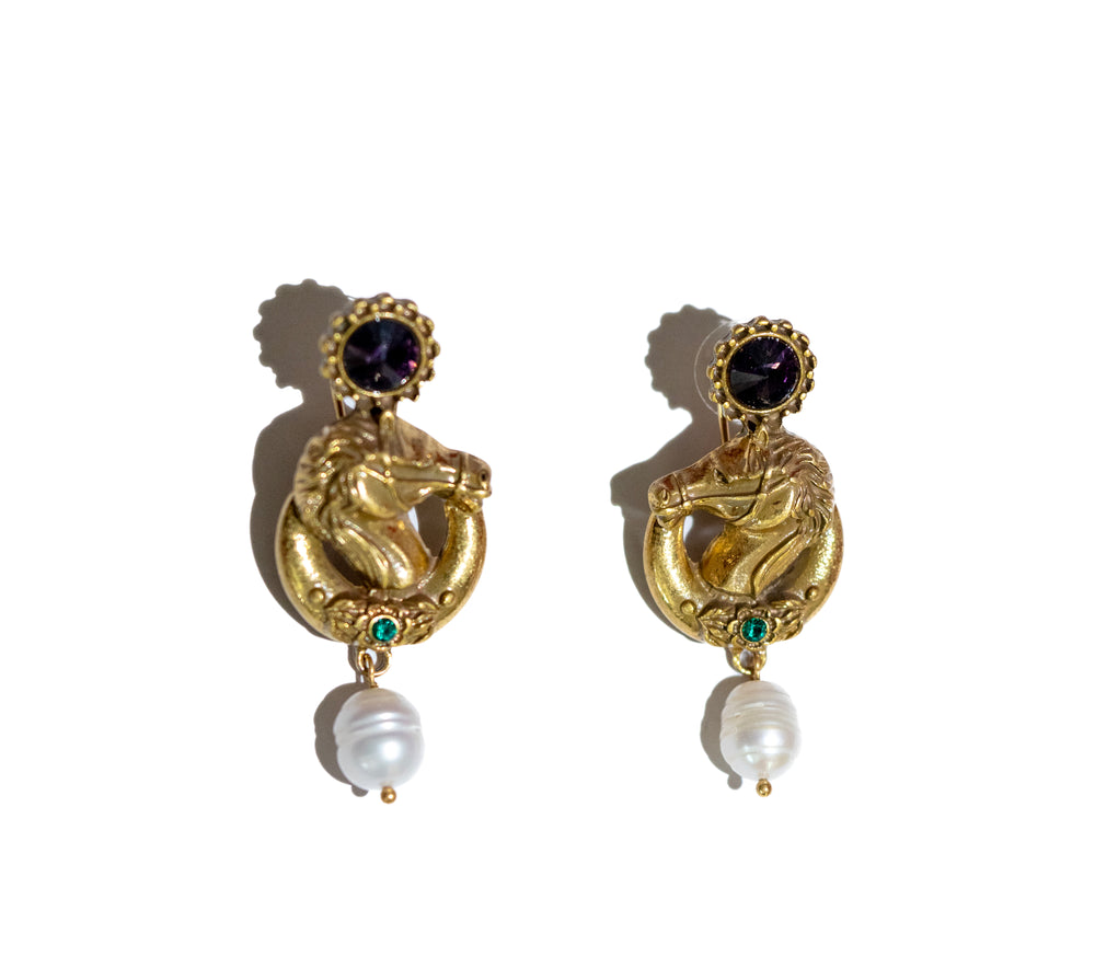 Antique-style drop earrings featuring a gold-tone horse motif framed in a circular design, accented with a purple stone stud, a small green stone detail, and finished with an elegant white pearl drop. Suitable for traditional and statement wear.