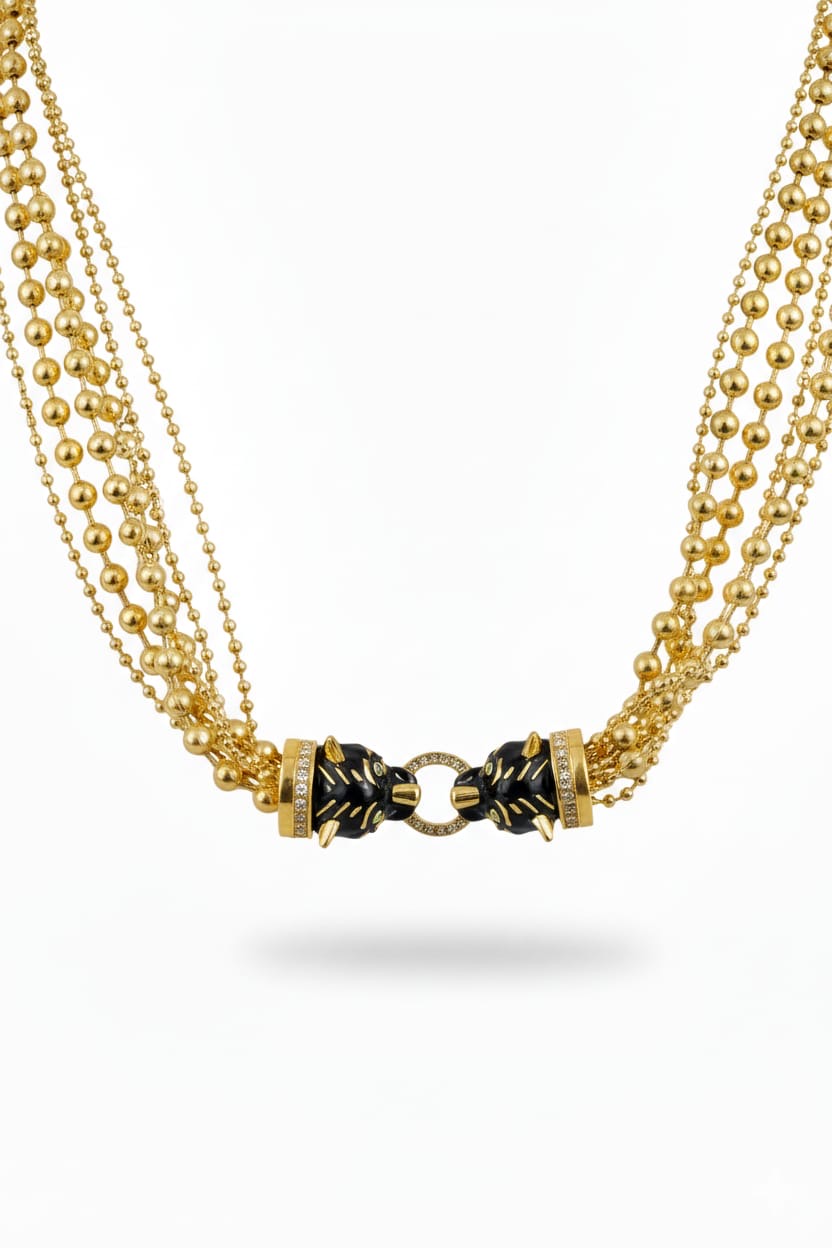 An elegant gold-tone multi-strand necklace featuring polished gold beads and a striking black central accent, finished with refined detailing for a bold yet luxurious look.