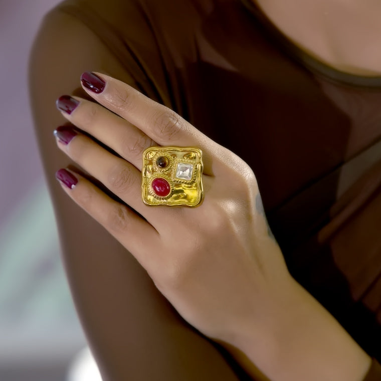A striking square statement ring crafted in a rich gold finish, adorned with mixed gemstone accents for a vintage-inspired look. Bold yet elegant, this ring is perfect for elevating festive, ethnic, or evening ensembles with a touch of artisanal charm.