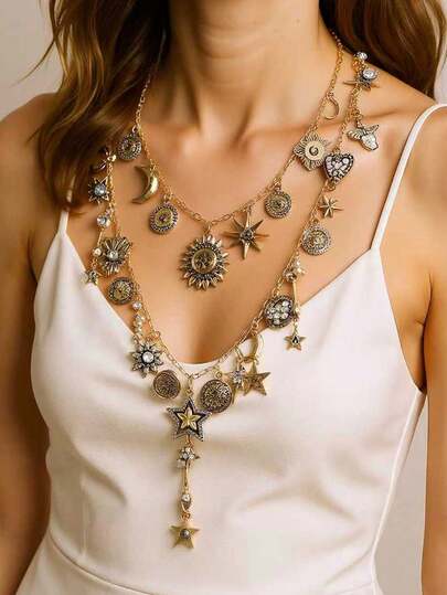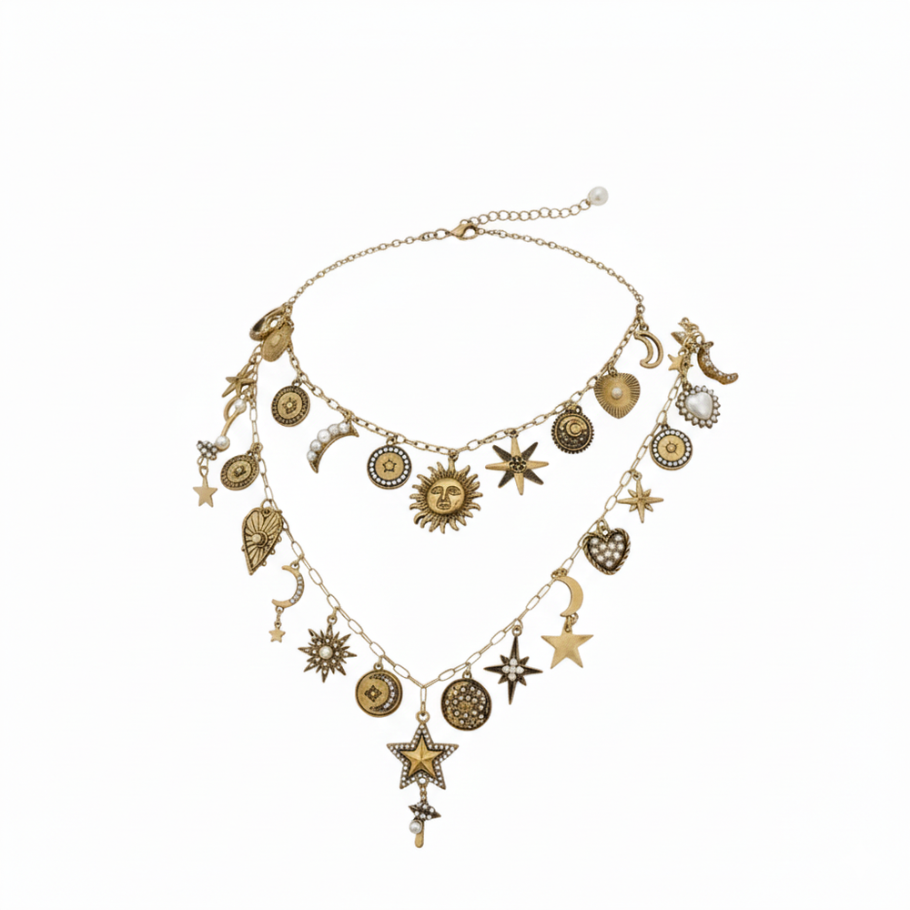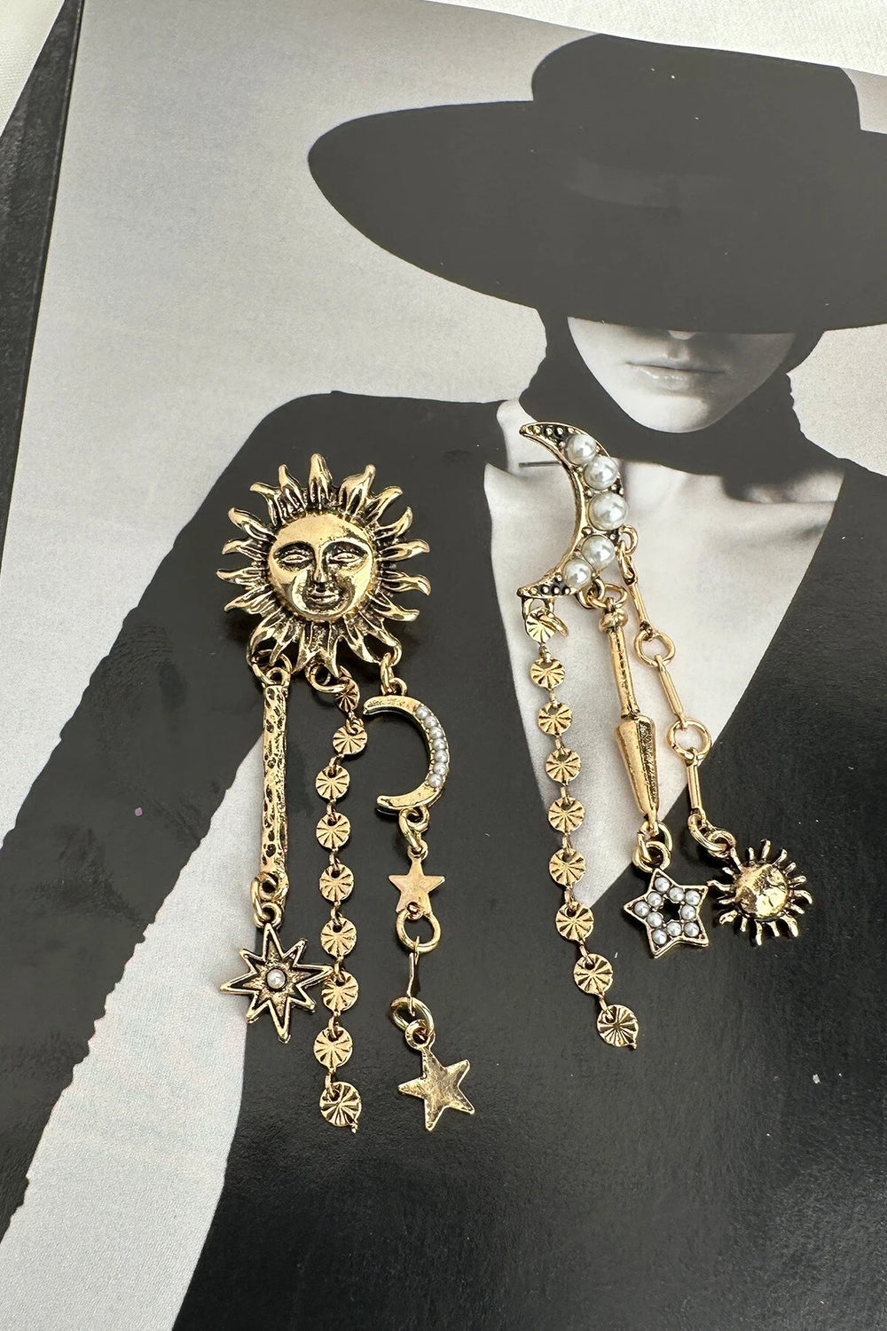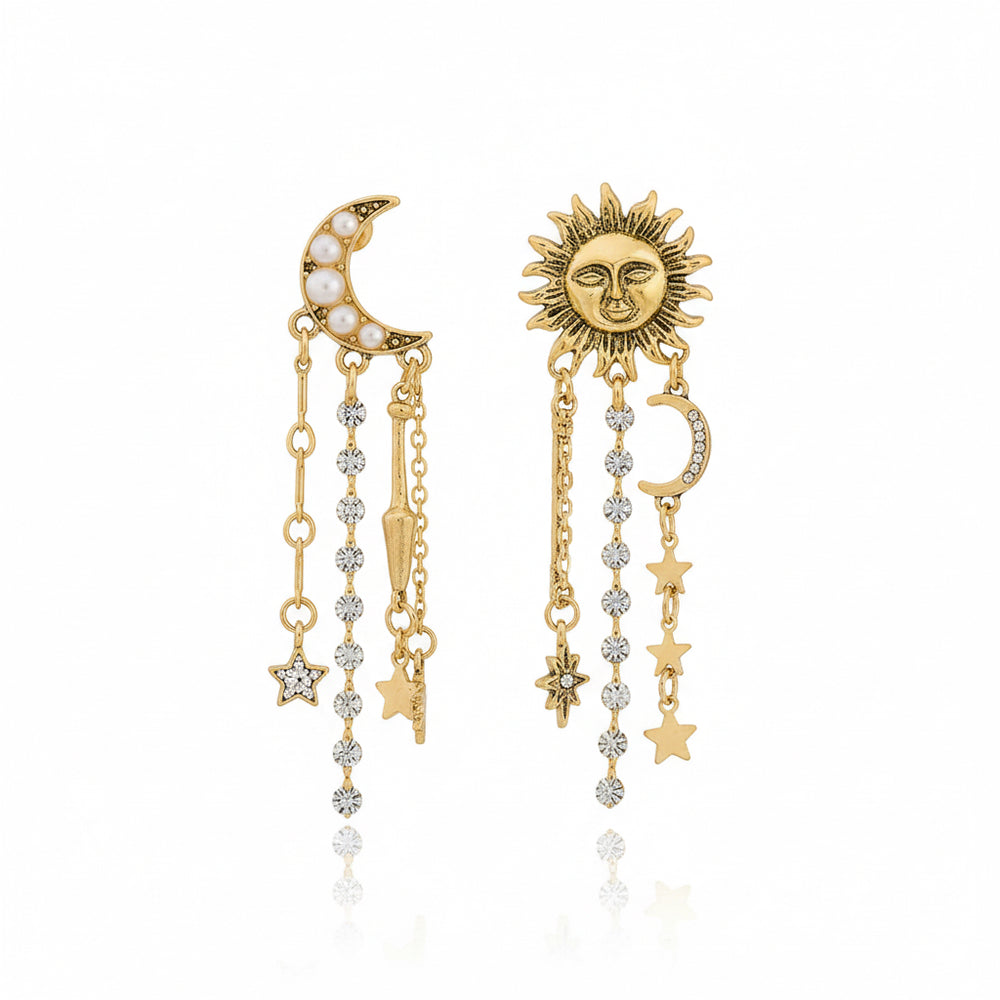 Elegant gold-toned statement earrings inspired by celestial beauty, featuring a radiant sun face, crescent moon, stars, and delicate chain drops. Perfect for festive wear, evening looks, and boho-inspired styling.