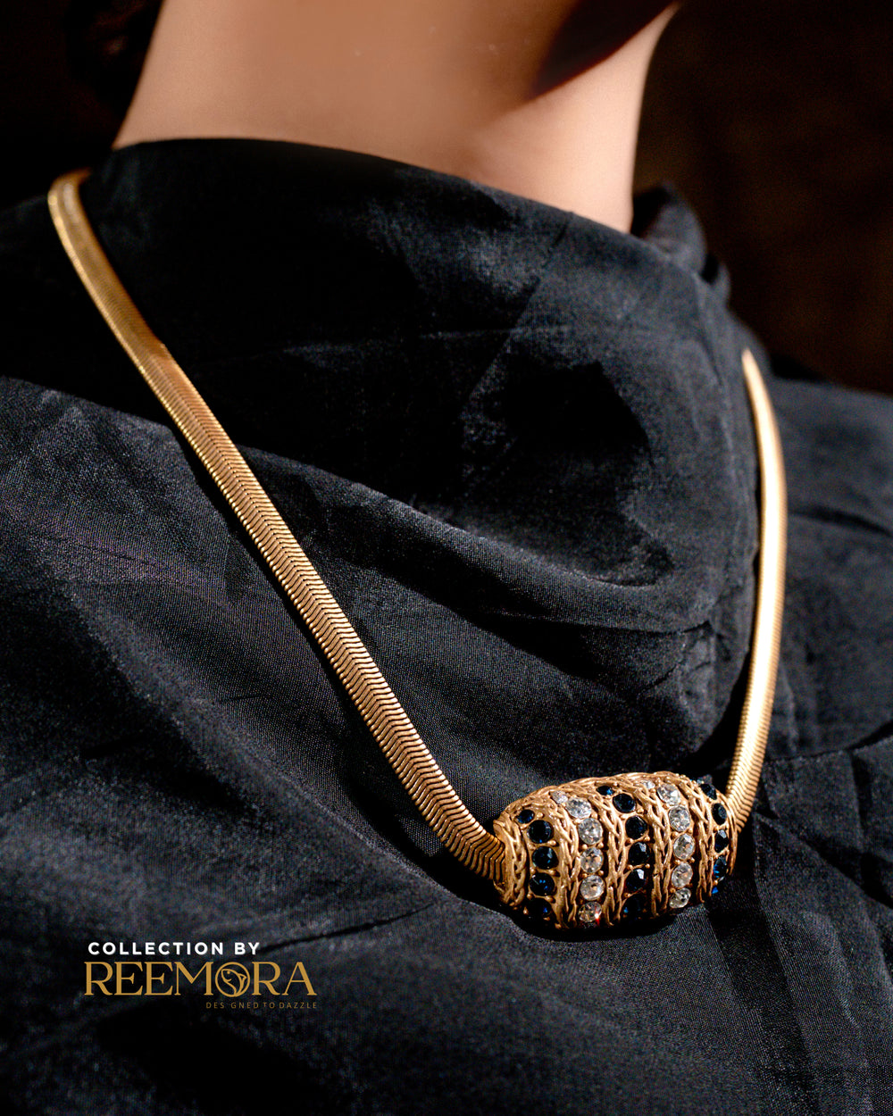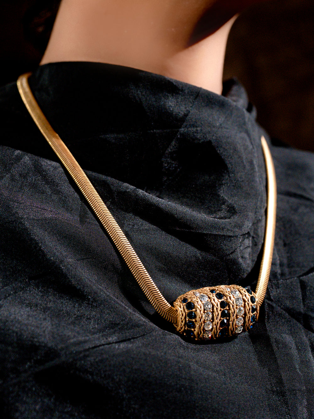 A sleek gold-tone necklace featuring a refined barrel-style centerpiece accented with dark and clear stones, offering timeless elegance and understated luxury.