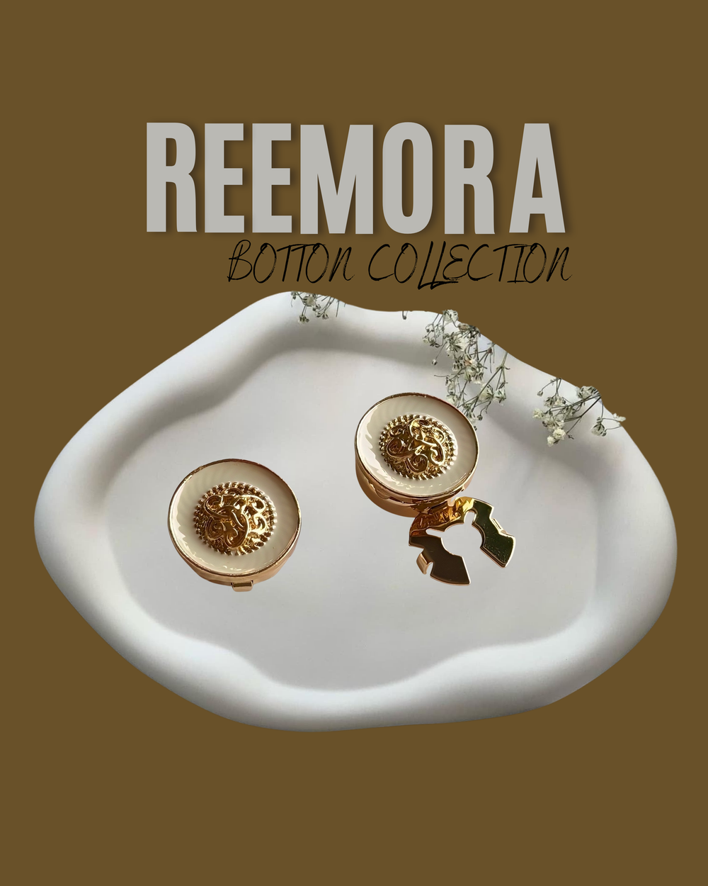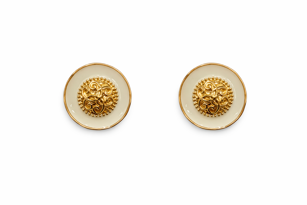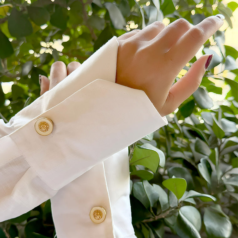 Timeless round cufflinks featuring an intricate gold crest set against a soft ivory base. A refined choice for formal occasions and heritage-inspired wardrobes.