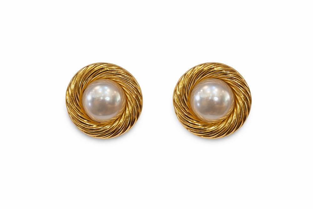 Elegant gold swirl frames encasing luminous faux pearls. Timeless and sophisticated, these cufflinks pair beautifully with formal shirts and tuxedos.