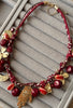 A vibrant red cord necklace adorned with glossy beads and antique gold charms, blending bold color with artisanal details for a striking, bohemian look.