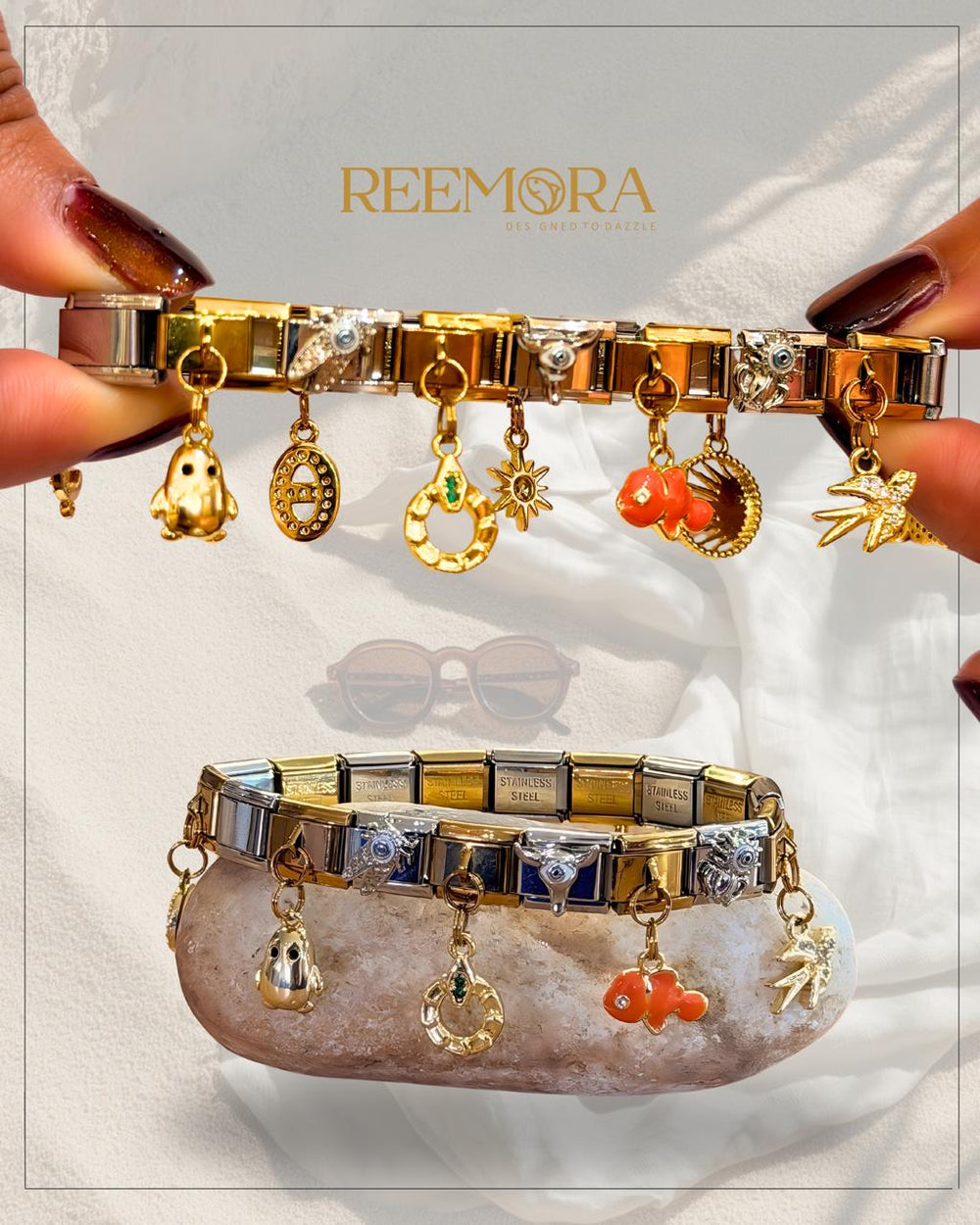 An elegant bracelet crafted in a striking mix of gold and silver tones, featuring delicate dangling charms for subtle movement and shine. Perfect for everyday luxury or layering with your favorite wristwear for a chic, modern look.