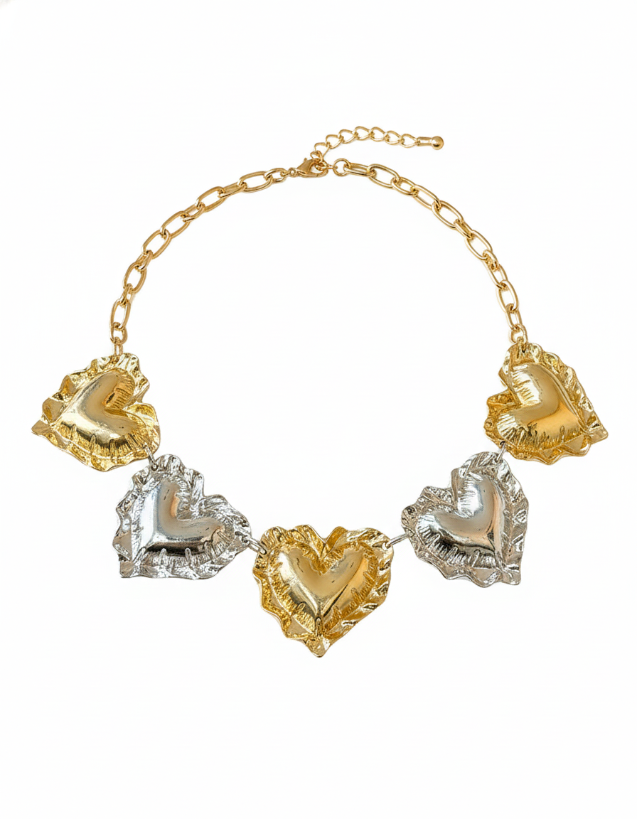 A bold statement necklace featuring hand-sculpted heart motifs in radiant gold and silver tones. The textured, organic finish creates a luxurious yet artistic look—perfect for elevating evening wear or adding a standout accent to contemporary outfits.