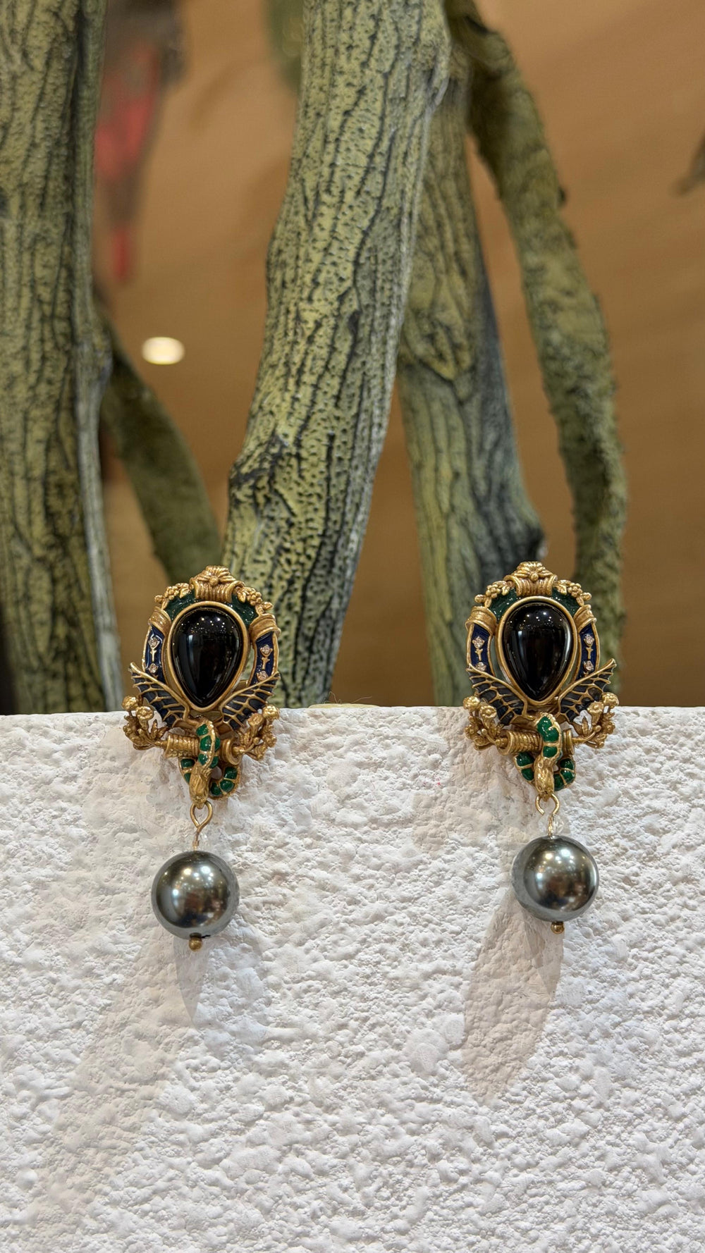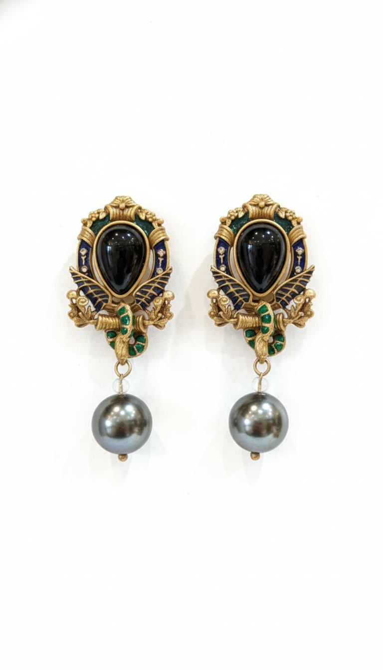 Gold-tone danglers featuring a scarab-inspired design with black and green stones and a pearl drop—perfect for statement and festive wear.