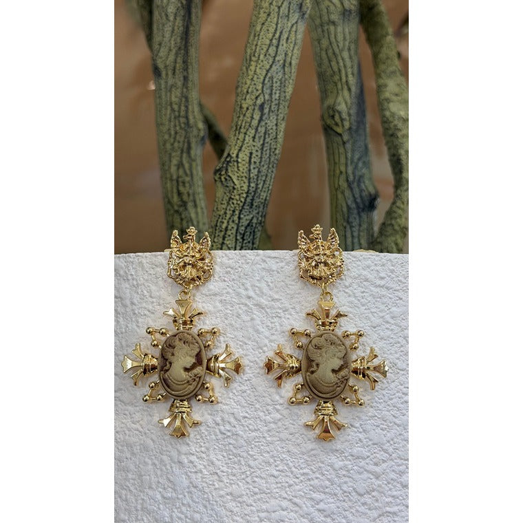 A close-up of a woman wearing ornate gold drop earrings featuring intricate detailing and a cameo-style centerpiece, highlighting their luxurious, classic design.