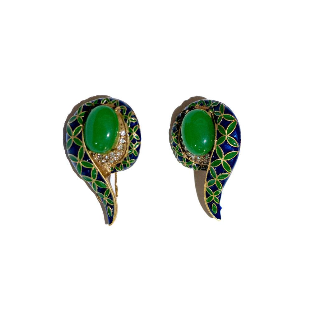 A refined paisley-inspired earring featuring a luminous emerald-green stone set in intricate gold detailing, offering a timeless blend of elegance and tradition.