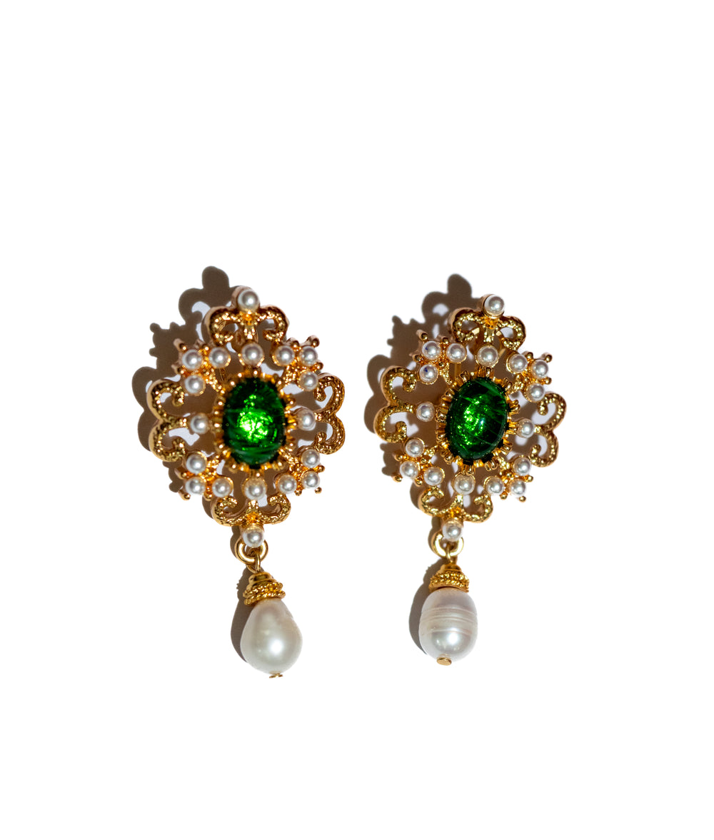 Elegant gold-toned earrings with a green central stone, pearl accents, and a delicate pearl drop—perfect for weddings and festive wear.