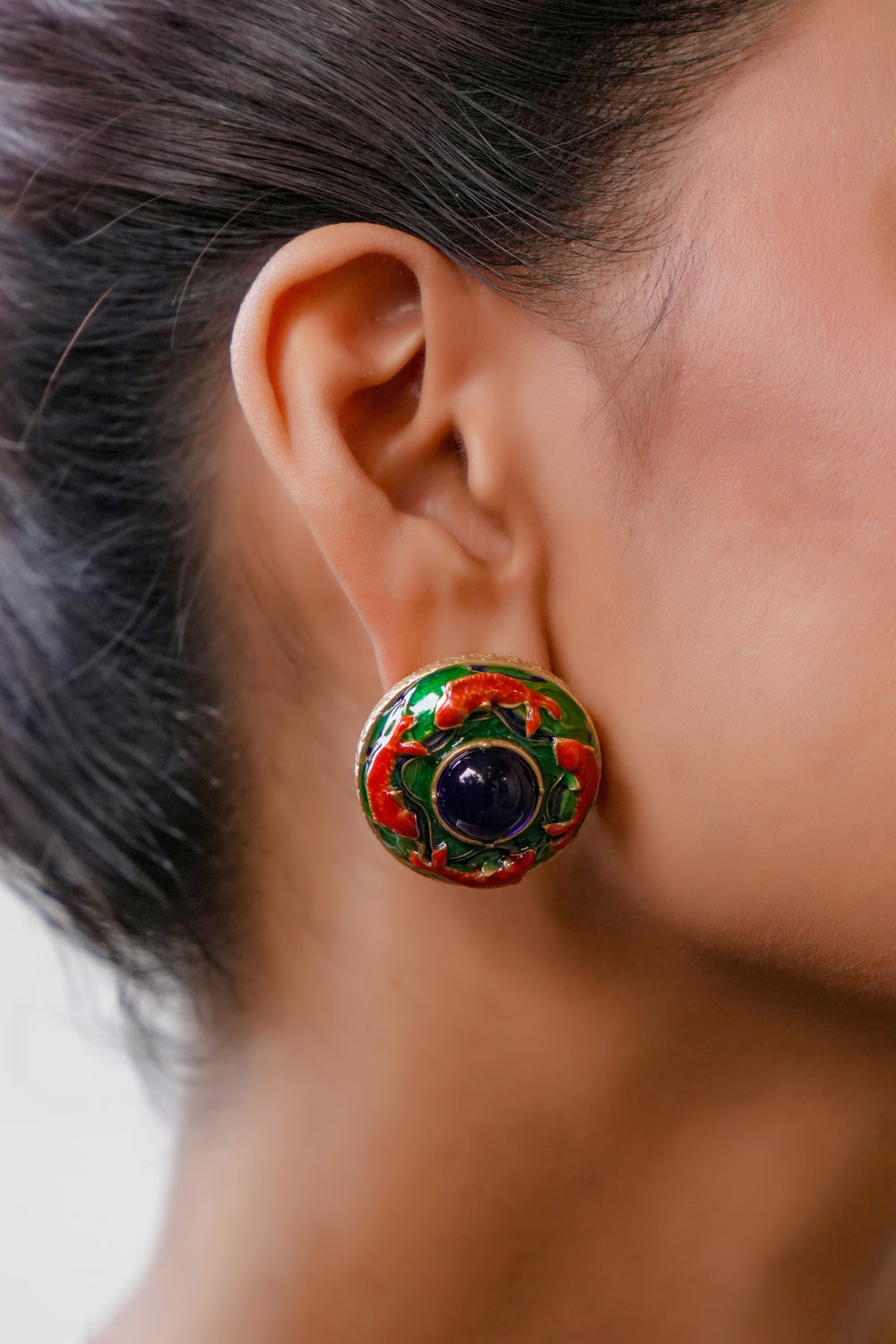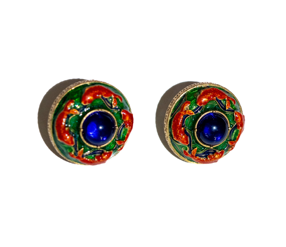Fish Traditional round stud earrings featuring green and red enamel floral detailing with a dark blue center stone and gold-tone finish, perfect for ethnic and festive wear.