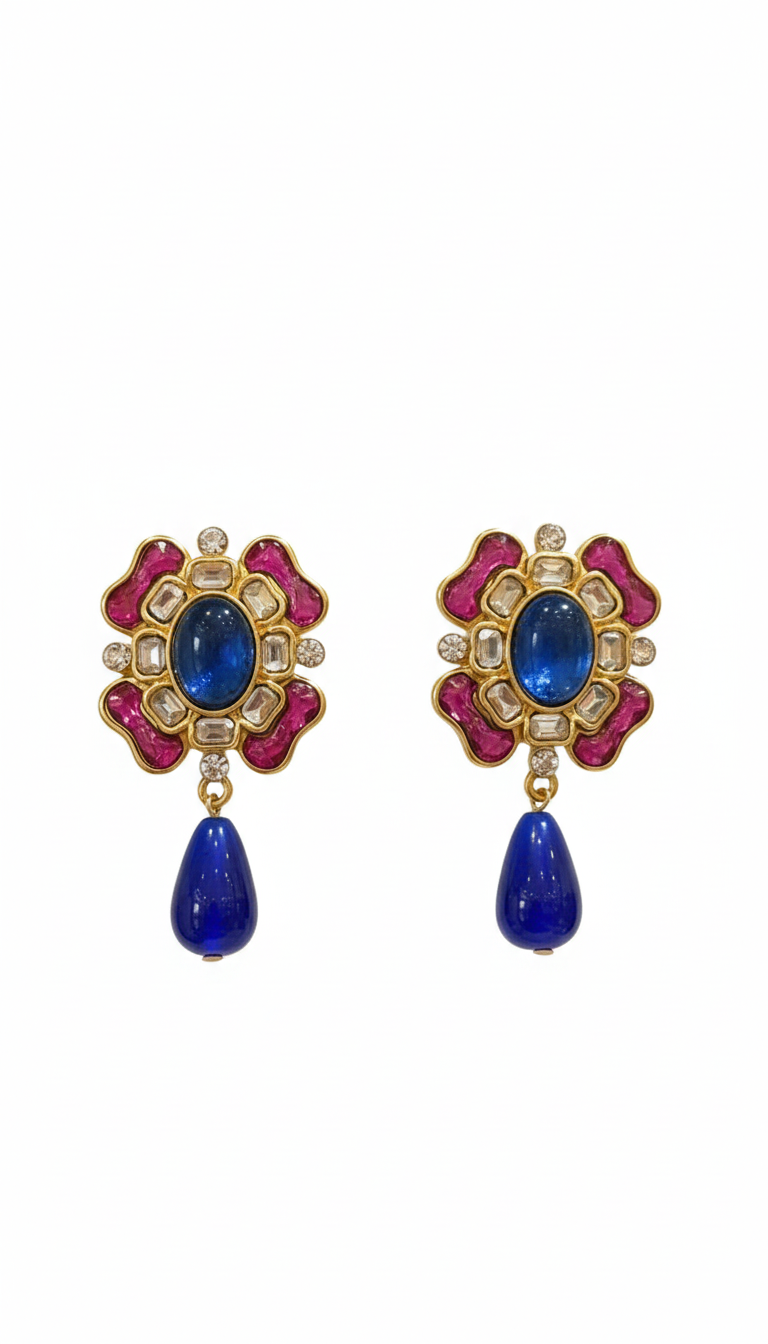 Elegant drop earrings featuring a gold-tone floral stud with pink and clear stone detailing, centered by a deep blue oval stone and finished with a matching blue teardrop dangle, perfect for festive and ethnic wear.