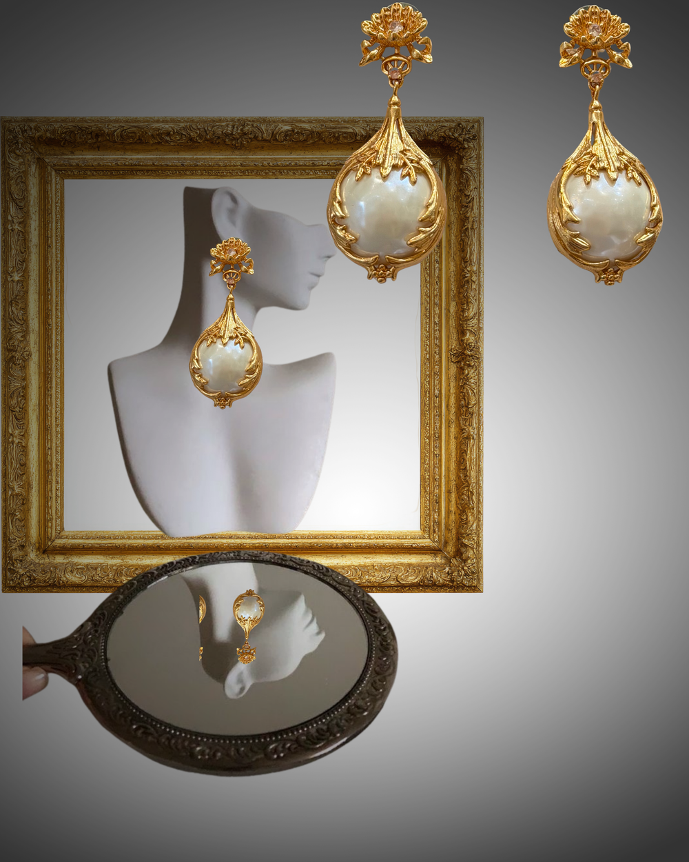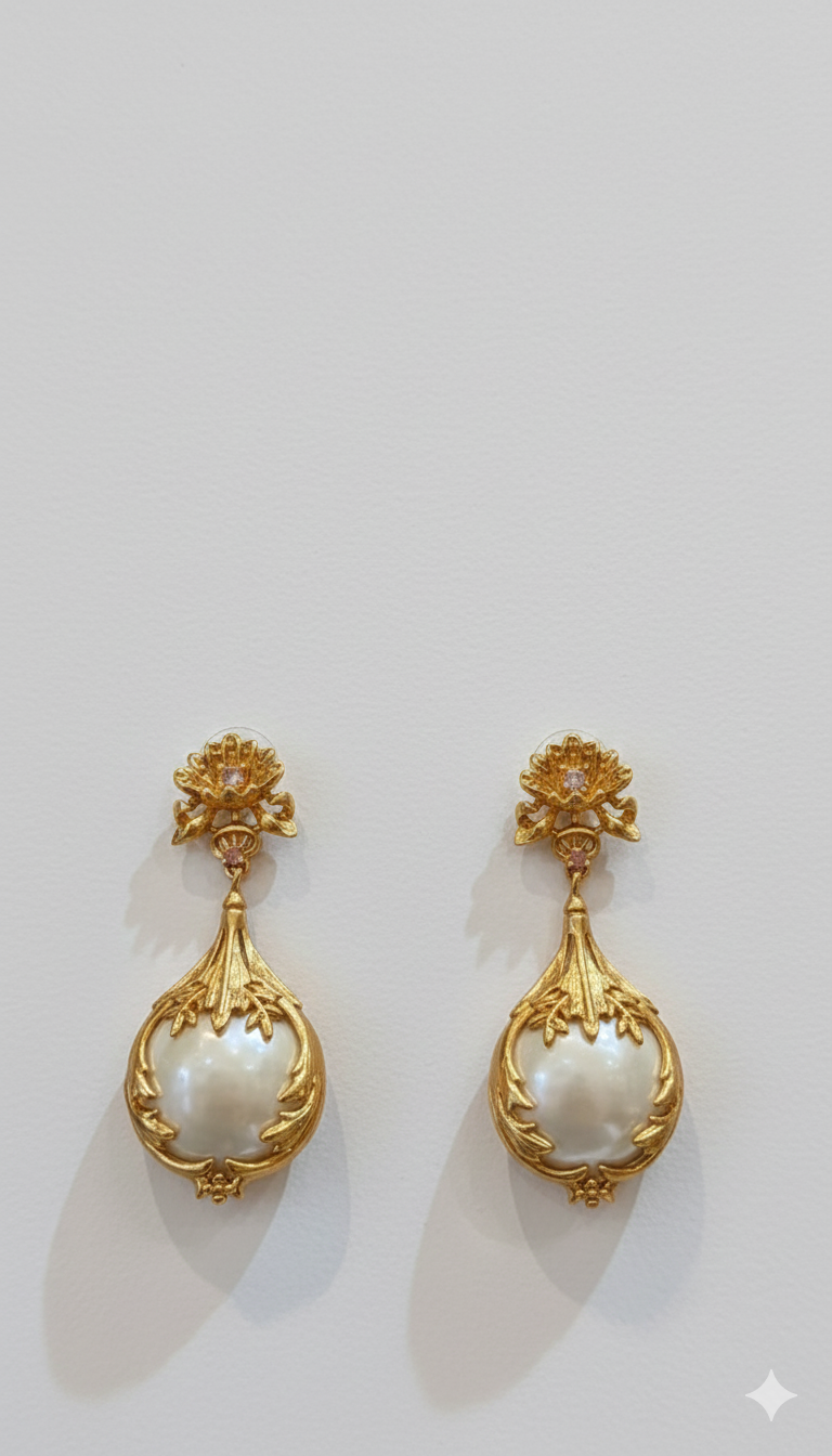 Gold-tone drop earrings featuring a delicate floral stud and an elegant pearl-style teardrop framed with ornate detailing, perfect for festive and classic wear.