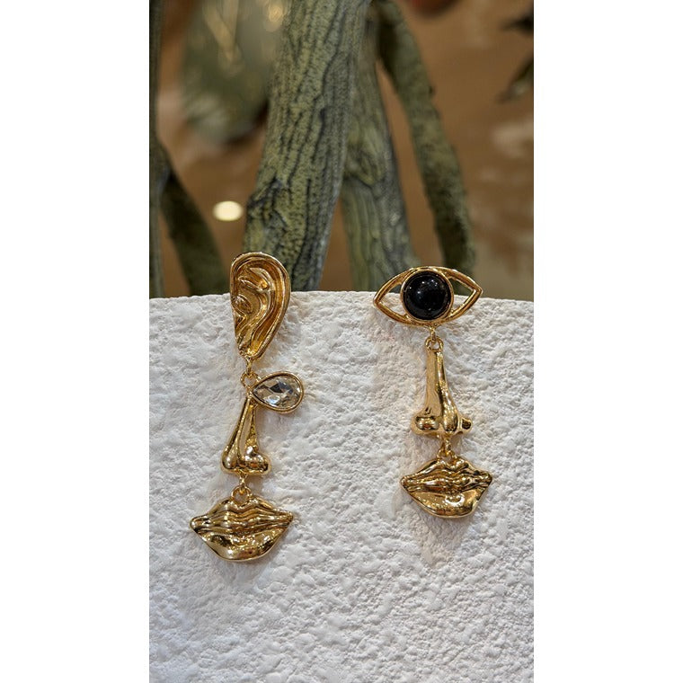 A close-up of artistic gold drop earrings inspired by facial features, combining eye, nose, and lip motifs for a bold and modern statement design.