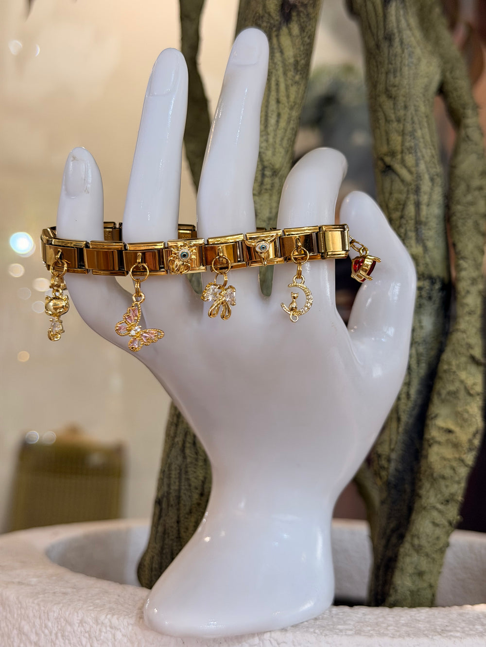 Elegant gold-tone charm bracelet featuring butterfly, bow, crescent moon, and teddy charms with evil-eye accents—perfect for a graceful, lucky, and everyday stylish look.