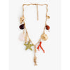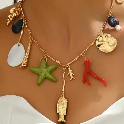 A delicate gold necklace adorned with ocean-inspired charms—including coral branches, shells, starfish, and pearls—creating a playful yet elegant coastal statement with artisanal flair.