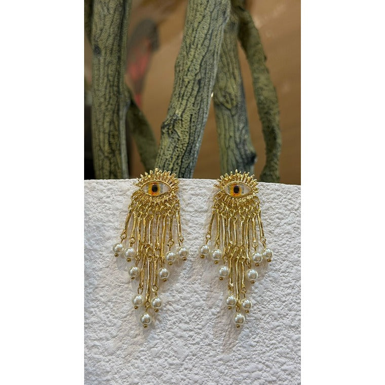 Statement gold drop earrings featuring a protective evil eye motif with cascading chain fringe and pearl accents, blending symbolic charm with elegant movement.