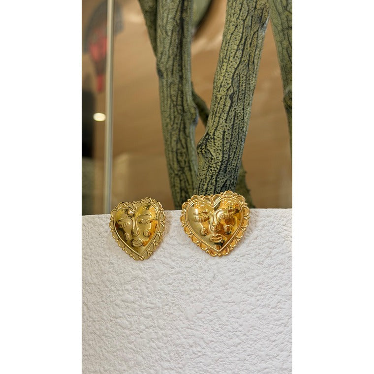 A close-up of unique gold stud earrings shaped like hearts with sculpted facial features, blending romantic symbolism with an artistic, statement design.