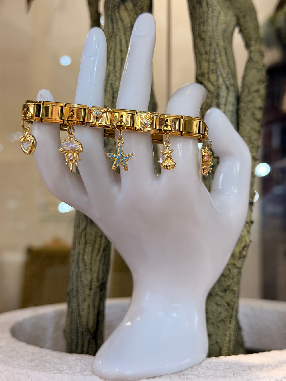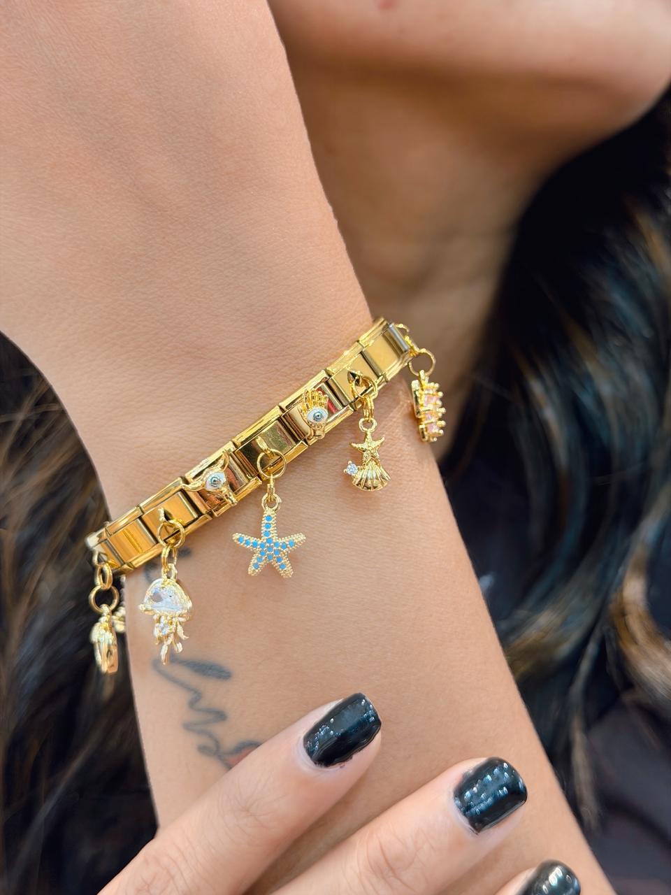 Stylish gold-tone charm bracelet featuring starfish, shell, ocean-inspired motifs, and evil-eye accents—perfect for a chic, lucky, and everyday elegant look.