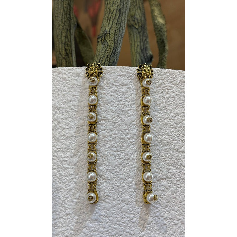 Elegant gold drop earrings featuring a vertical line of luminous pearls set in delicate gold detailing, creating a timeless and sophisticated statement with graceful movement.