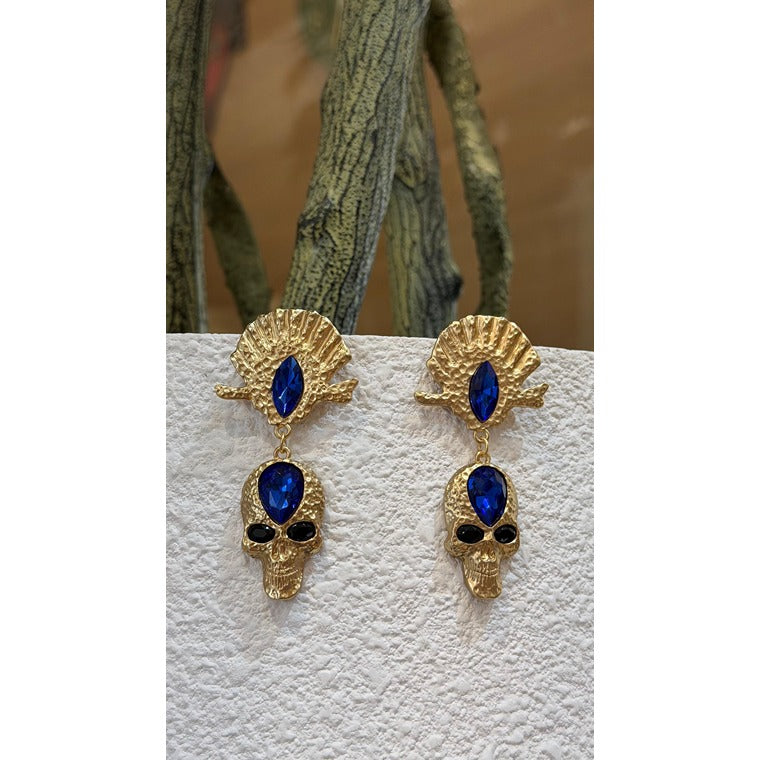 A close-up of bold gold drop earrings featuring a skull motif accented with deep blue gemstones, blending edgy symbolism with a luxe statement design.