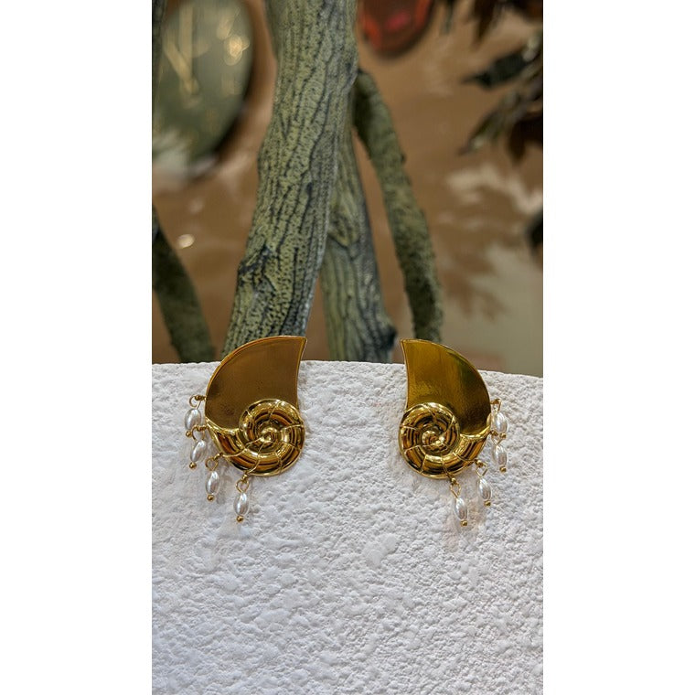 A close-up of modern gold earrings featuring a spiral design accented with delicate pearl drops, offering a contemporary yet elegant statement look.