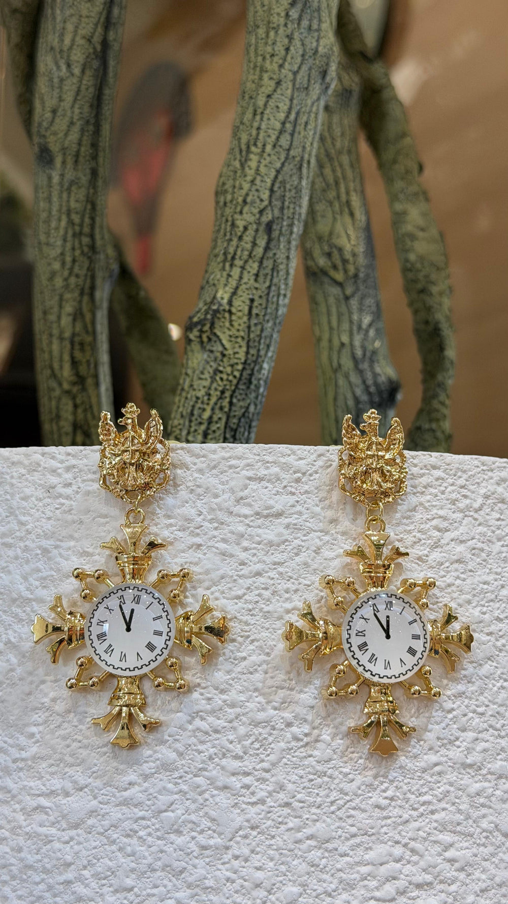 Elegant gold-toned statement earrings featuring a unique clock-inspired centerpiece with intricate detailing. Perfect for festive occasions, parties, and fashion-forward looks, these designer drop earrings add a bold, artistic charm to any outfit.