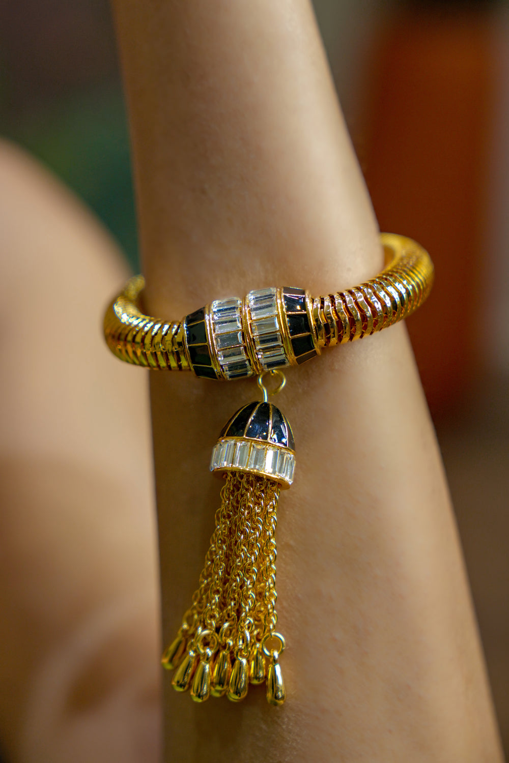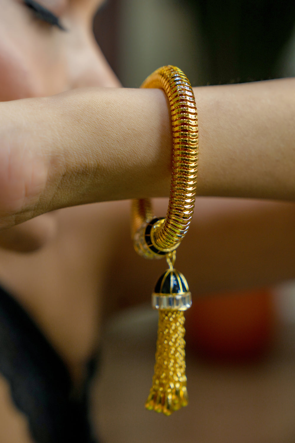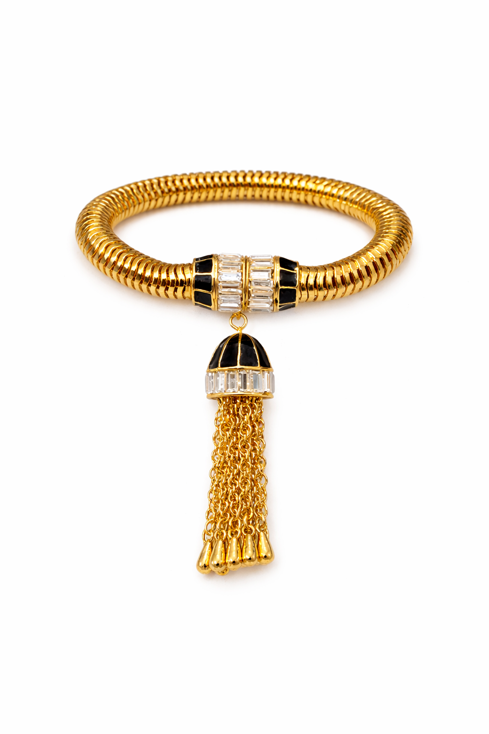 A bold and elegant gold coil bracelet featuring a striking black-and-gold tassel charm, perfect for adding a touch of luxury and sophistication to any outfit.