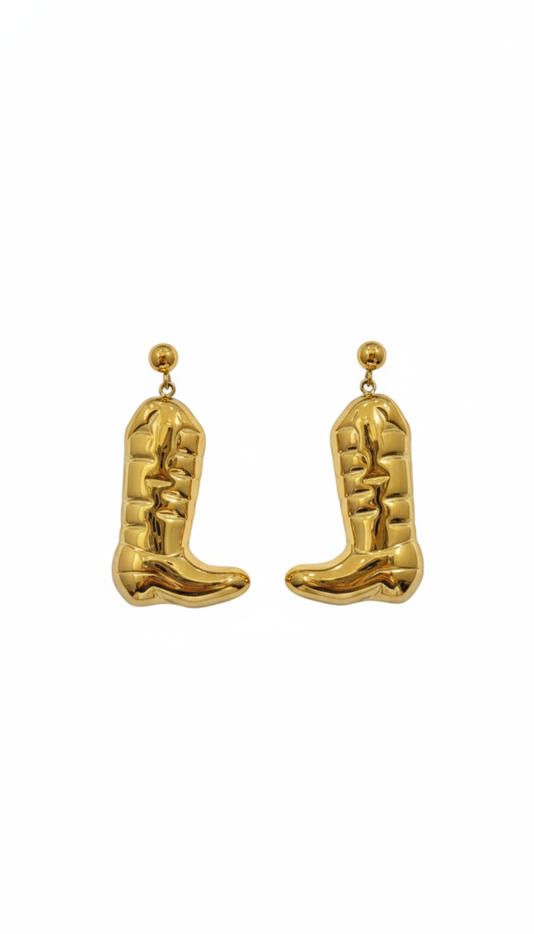 Bold and playful gold-tone drop earrings shaped like cowboy boots, featuring a glossy finish and detailed design—perfect for statement styling with a western-chic vibe.