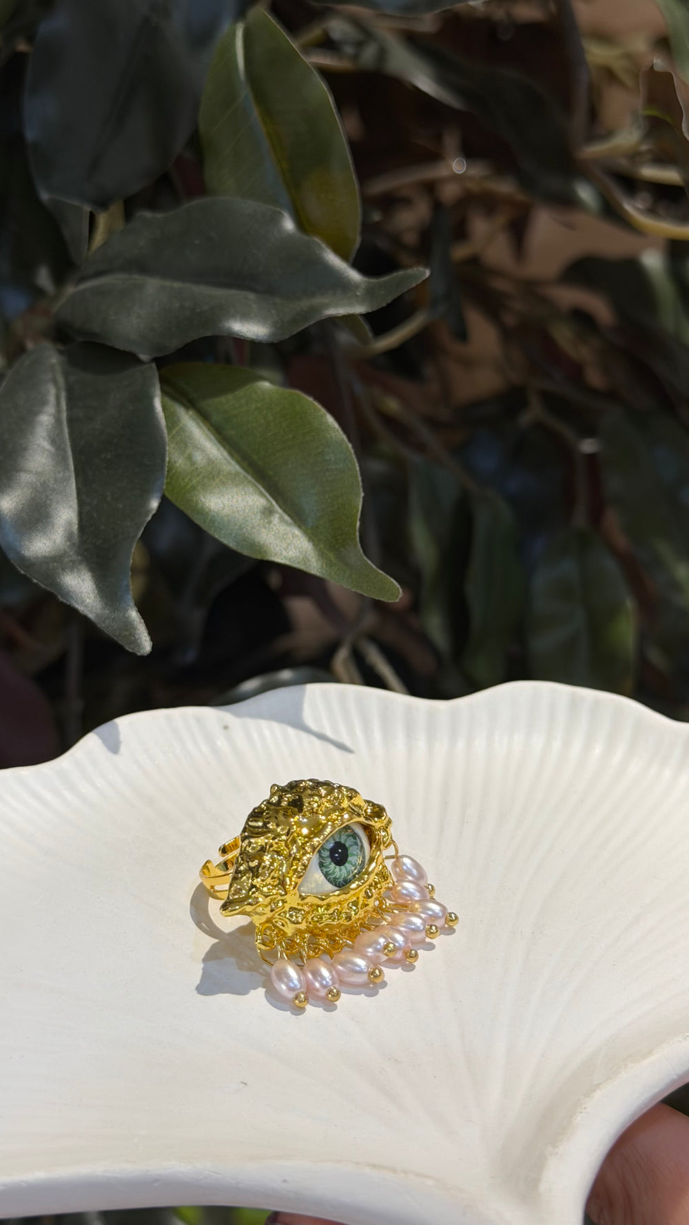 A striking statement ring featuring a protective evil eye motif framed in ornate gold detailing, finished with delicate pearl drops. Bold yet elegant, it adds a touch of mystique and luxury to festive and evening looks.