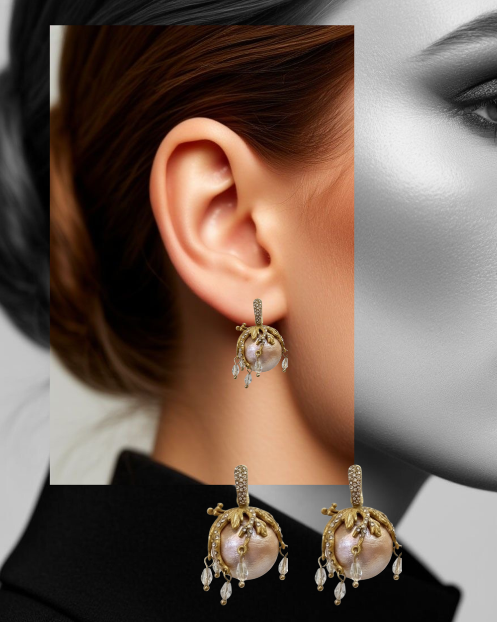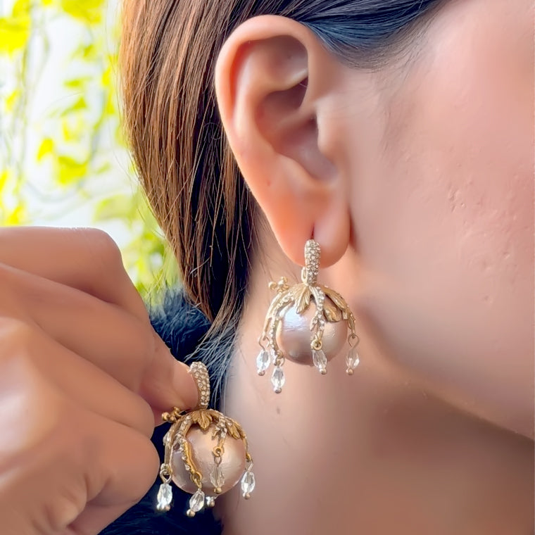 Elegant gold-tone dome earrings featuring a lustrous pearl center with delicate droplet accents—perfect for festive, bridal, and evening wear.