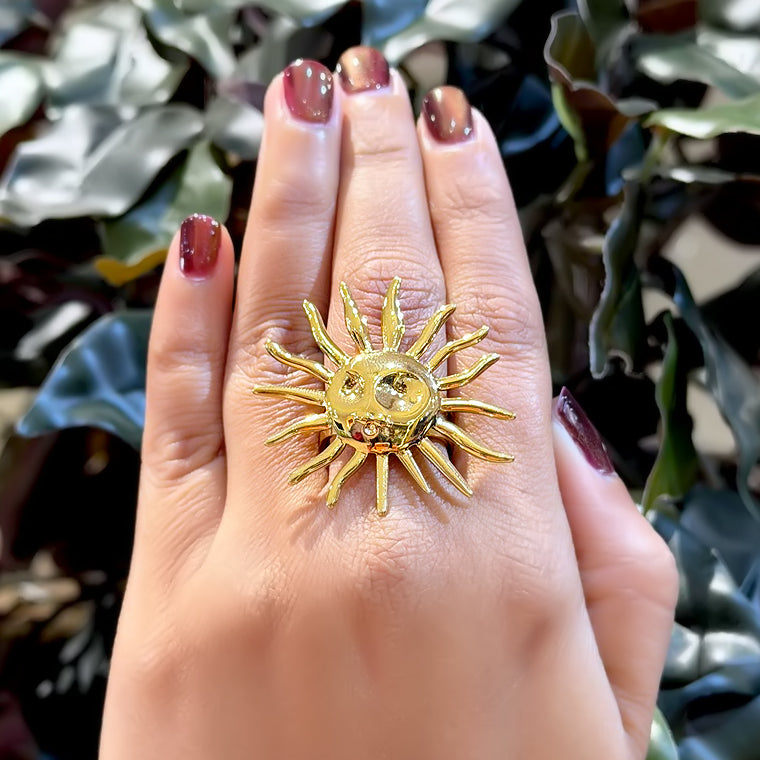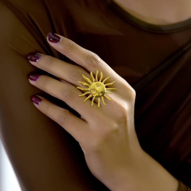 A bold sun-inspired statement ring crafted in a radiant gold finish, symbolizing warmth, power, and positive energy. Perfect for adding a striking artistic touch to both day and evening looks.