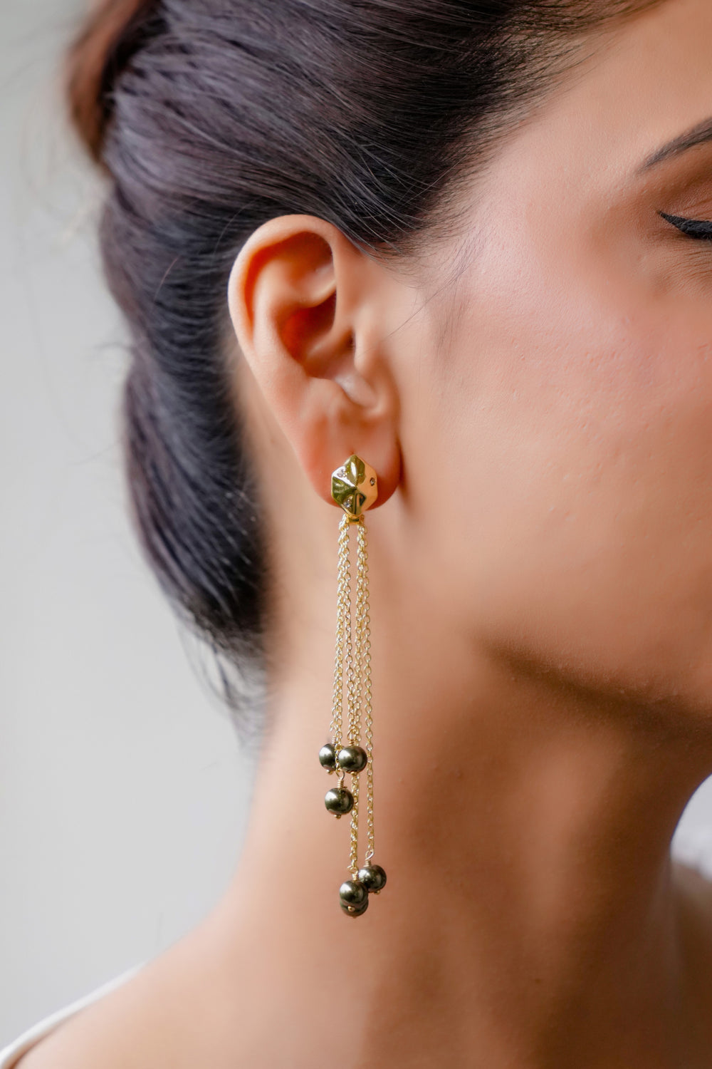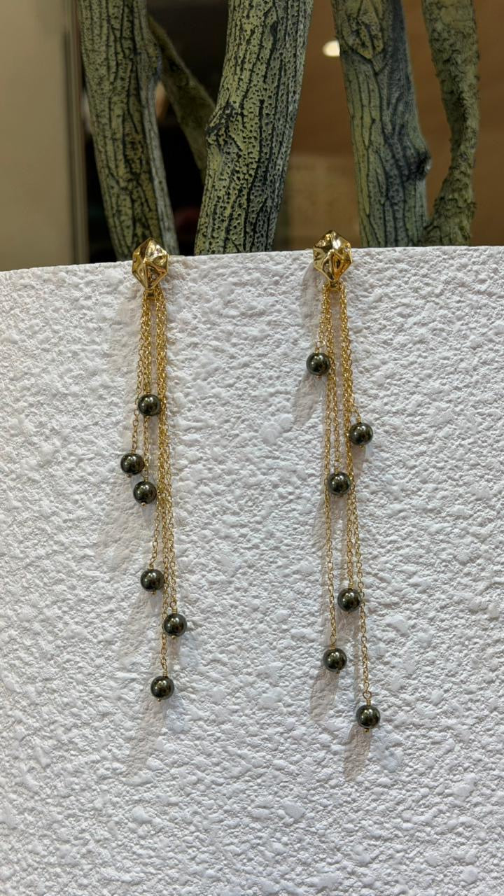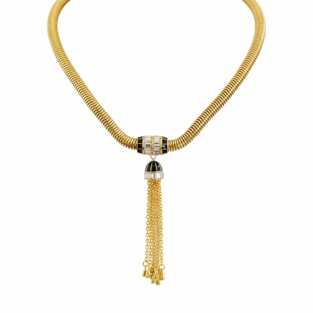 Elegant gold-tone statement necklace featuring a sleek tubular design with a cascading tassel accent, paired with a matching bracelet for a bold yet refined look.