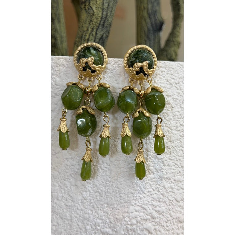 A close-up of graceful gold drop earrings adorned with cascading green beads, offering a refined and nature-inspired statement with a touch of vintage charm.