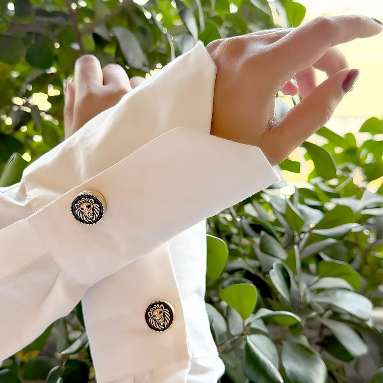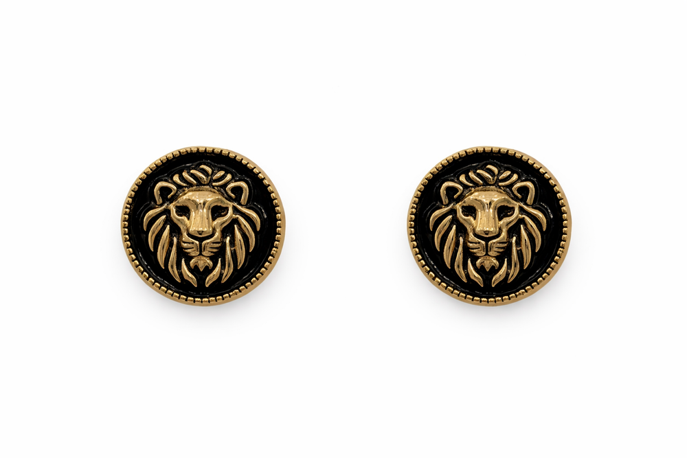 A bold round blazer patch featuring a sculpted gold lion head on a black background. Representing courage, authority, and leadership, this powerful design is ideal for statement tailoring and premium fashion styling.