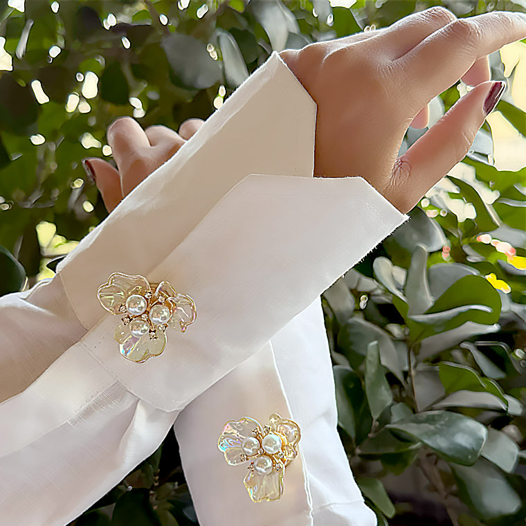 Delicate and luminous, these floral cufflinks showcase iridescent petals accented with soft pearl centers. Designed to bring femininity and grace to tailored outfits, they add a touch of romance to refined dressing.