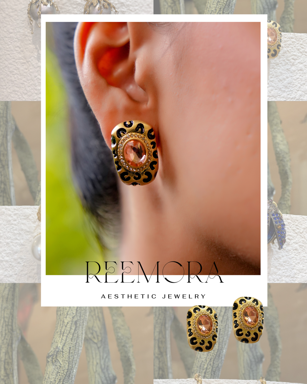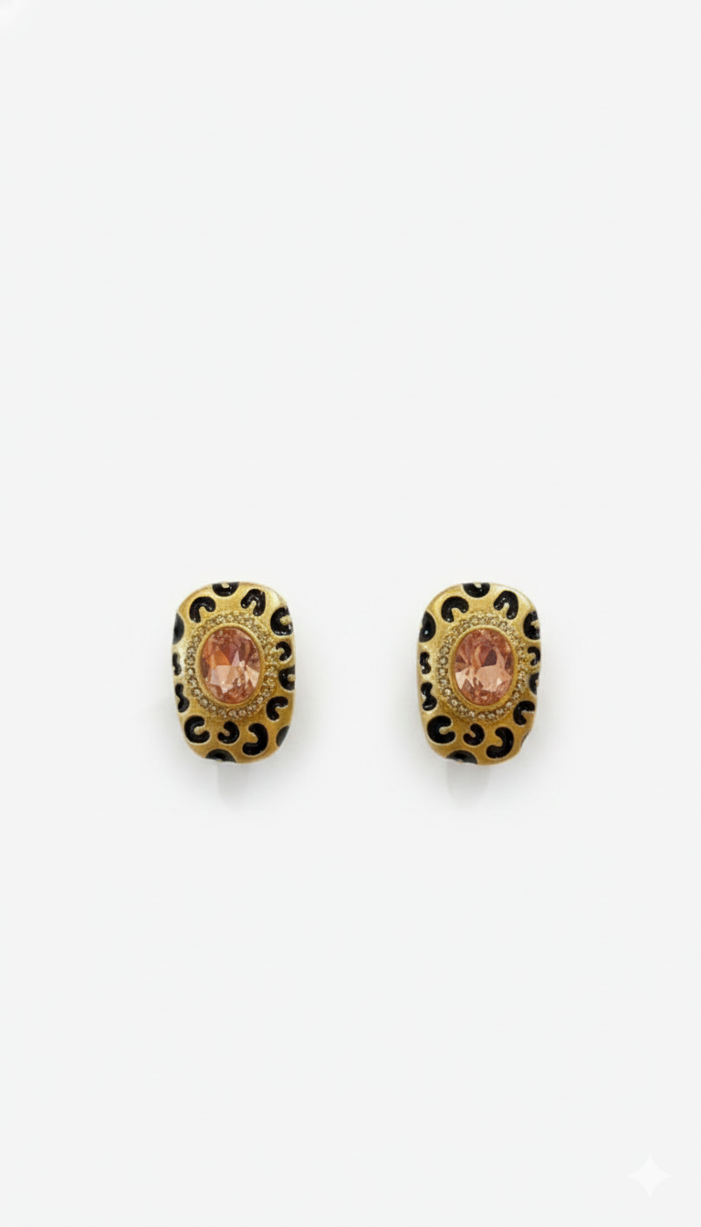 Gold-tone stud earrings with a bold leopard-print design and a central peach stone—perfect for chic and statement looks.