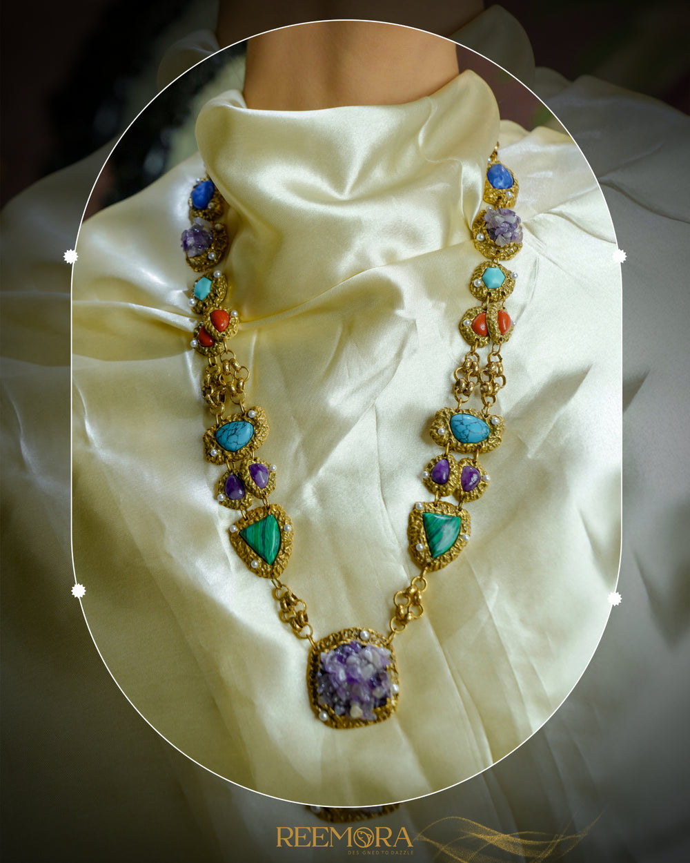 A bold gold-tone necklace adorned with turquoise, amethyst, coral, and blue stones, finished with pearl accents and a textured amethyst cluster pendant for an elegant, artistic statement.