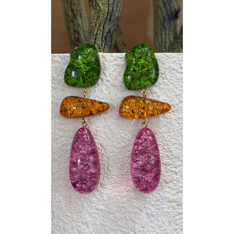 A close-up of bold drop earrings featuring textured resin elements in green, amber, and pink tones, creating a playful and modern statement accessory.