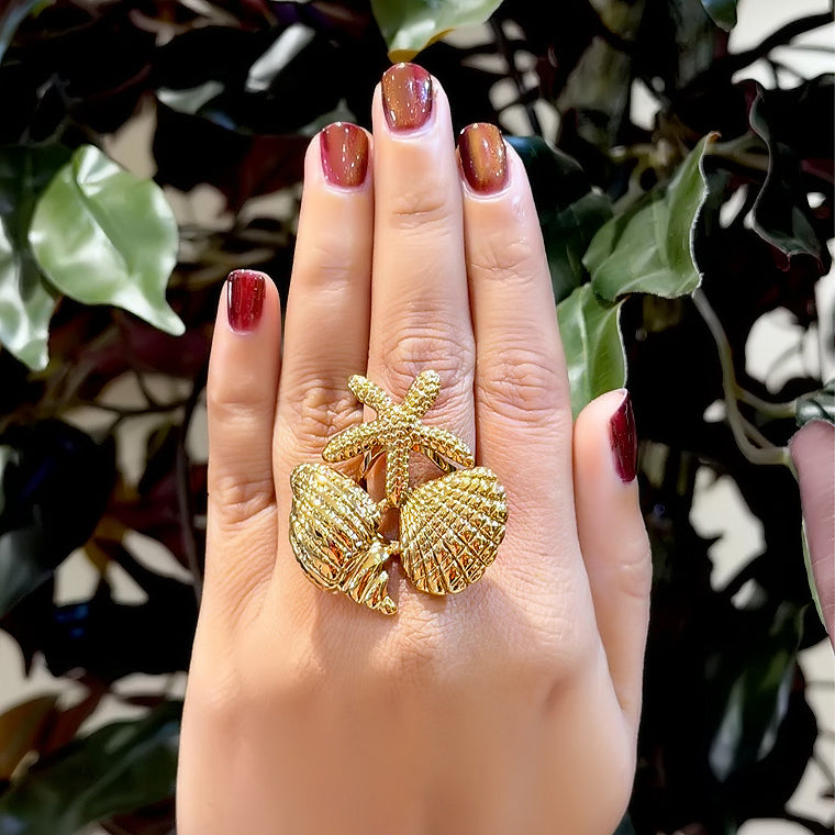 Inspired by the sea, this ring features shell textures and a starfish motif in a gold finish. A perfect choice for beach lovers and summer styling.