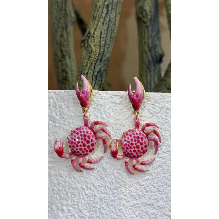 A close-up of playful pink crab-shaped drop earrings with detailed enamel work, adding a fun and bold touch to a fashionable look.