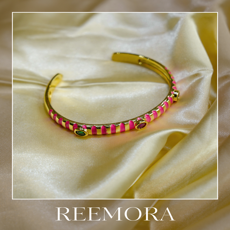 A chic gold cuff accented with vibrant pink enamel stripes and sparkling gemstones. Elegant, trendy, and perfect for adding a bold pop of color to any outfit.