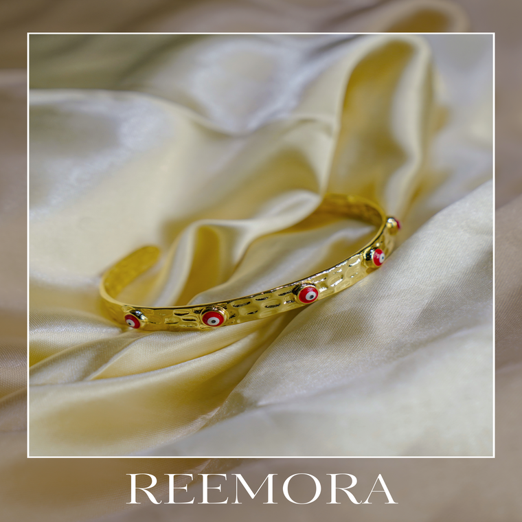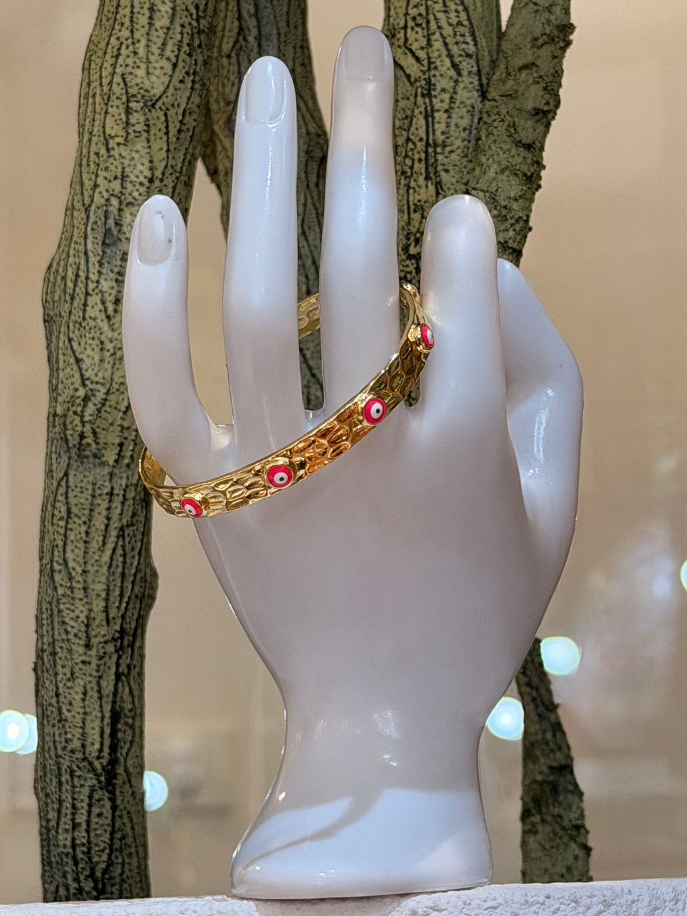 A gold-textured cuff bracelet accented with pink evil eye charms, blending protection and chic style for everyday wear.