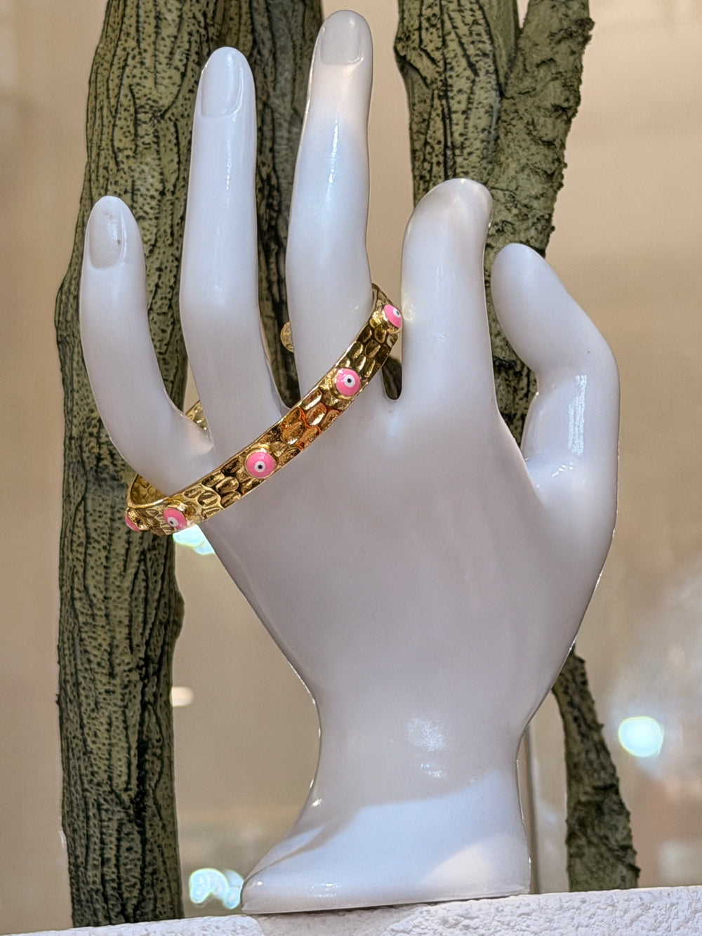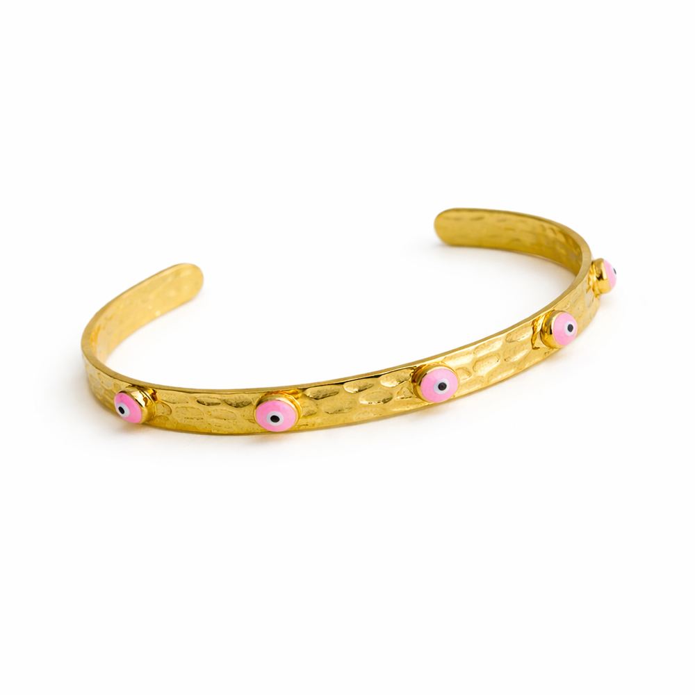 A chic hammered gold cuff bracelet adorned with pink evil eye charms, designed for protection and style—perfect for daily wear or stacking.