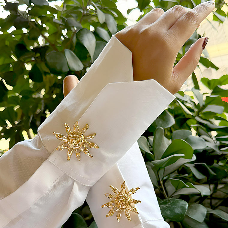 Bold and eye-catching, these sunburst cufflinks feature a radiant gold design with sculpted rays. Symbolizing warmth and confidence, they are perfect for power dressing and standout formal wear.