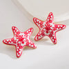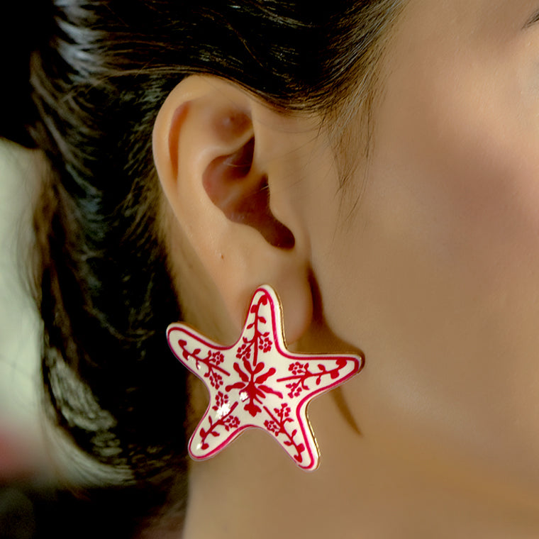 Bold starfish-shaped earrings featuring a striking red floral pattern with a glossy finish. Perfect for adding a playful, artistic touch to festive and casual looks.