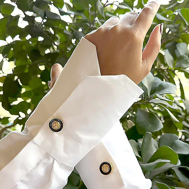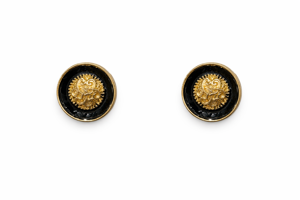 A refined round blazer patch featuring an ornate gold crest set against a black enamel background. This timeless design evokes heritage luxury and sophistication, making it perfect for classic blazers and formal ensembles.
