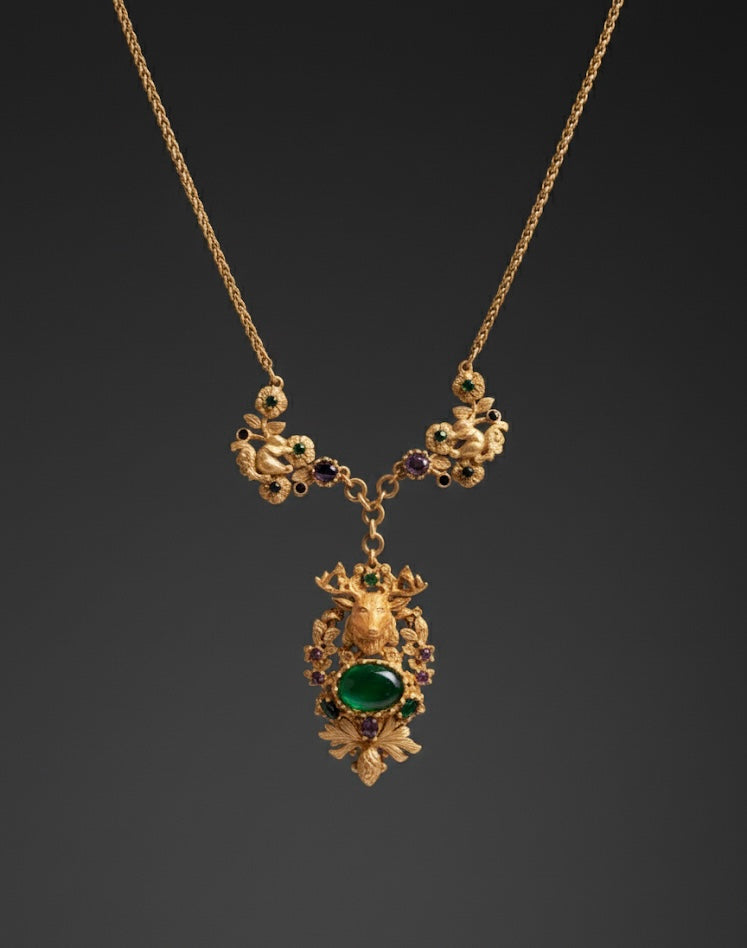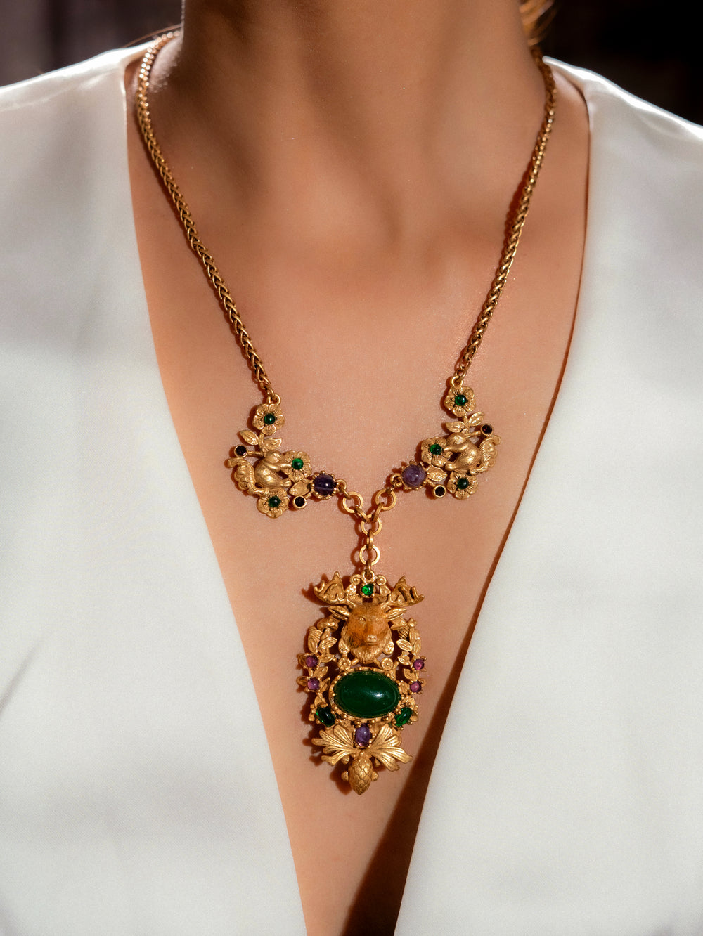 An ornate gold-tone necklace featuring intricate sculpted details and a striking emerald-green centerpiece, accented with delicate gemstone highlights for a timeless, statement-making look.