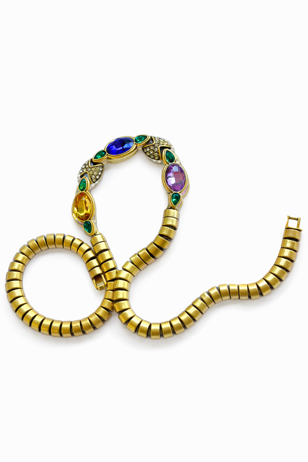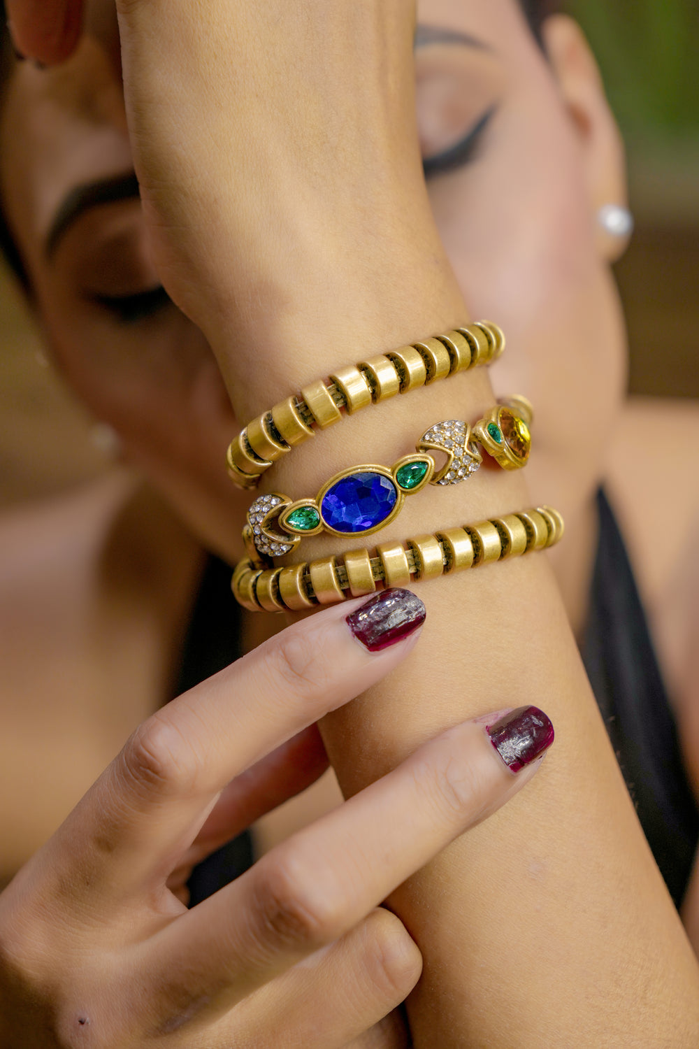 A luxurious statement bracelet featuring a bold royal blue center stone accented with emerald gems and diamond-like detailing. Perfect for elevating any festive or evening look with a touch of elegance.