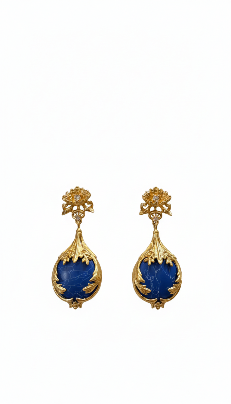 Gold-tone danglers with a rich blue enamel centerpiece framed in ornate detailing—perfect for festive and elegant wear.